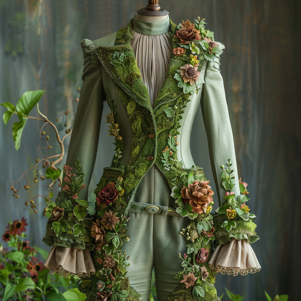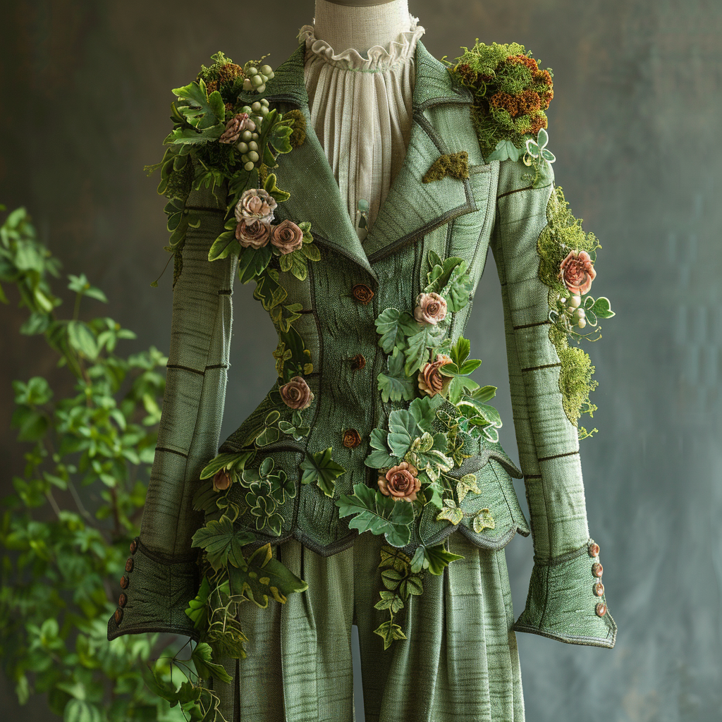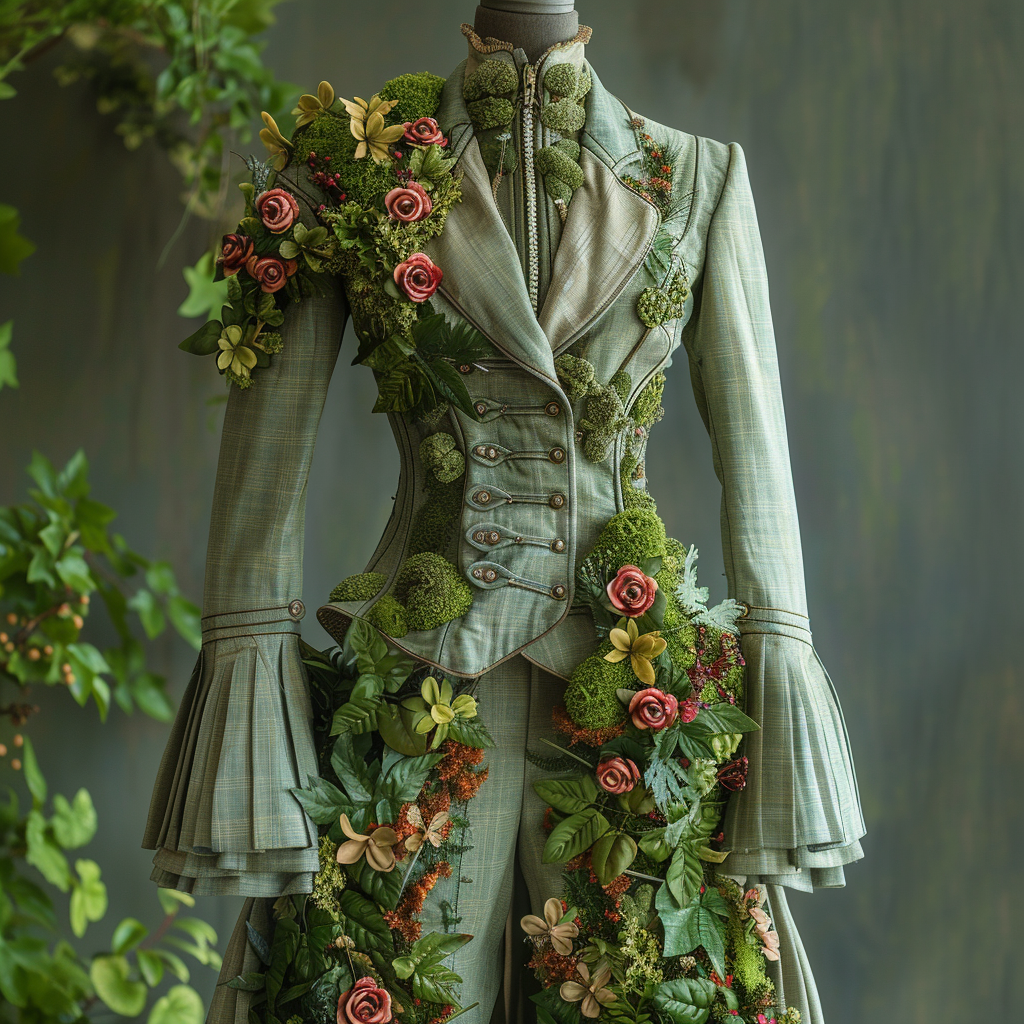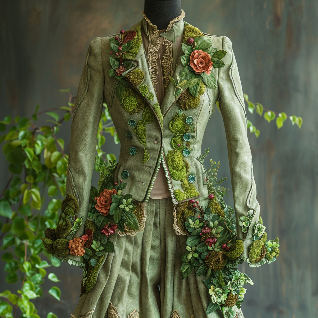 Recently, as part of an assignment at SEFT, a digital fashion academy, I had the opportunity to dive into this innovative realm using Midjourney, a platform that allows for creative and imaginative visualizations. Inspired by the beauty of nature and the necessity for sustainable practices, I conceptualized a collection featuring a living moss suit, a corset, and a dress, all infused with Victorian-era elements. These pieces seamlessly integrate living moss into their fabric, creating living, breathing fashion statements. This innovation is a testament to the growing trend of nature-infused fashion, where the boundaries between nature and style are beautifully blurred.
