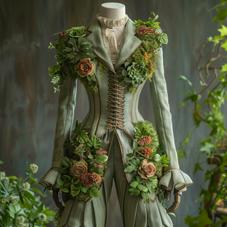 Conceptualizing the Living Moss Collection, which includes a pantsuit, corset, and dress, was a deeply personal and imaginative endeavor for me. Using Midjourney, I was able to visualize garments that not only celebrate the beauty of nature but also embody sustainable fashion practices while drawing inspiration from the elegance of the Victorian era. The process of creating these concepts was both challenging and exhilarating, as I sought to balance the delicate nature of living moss with the practicalities of wearable fashion.