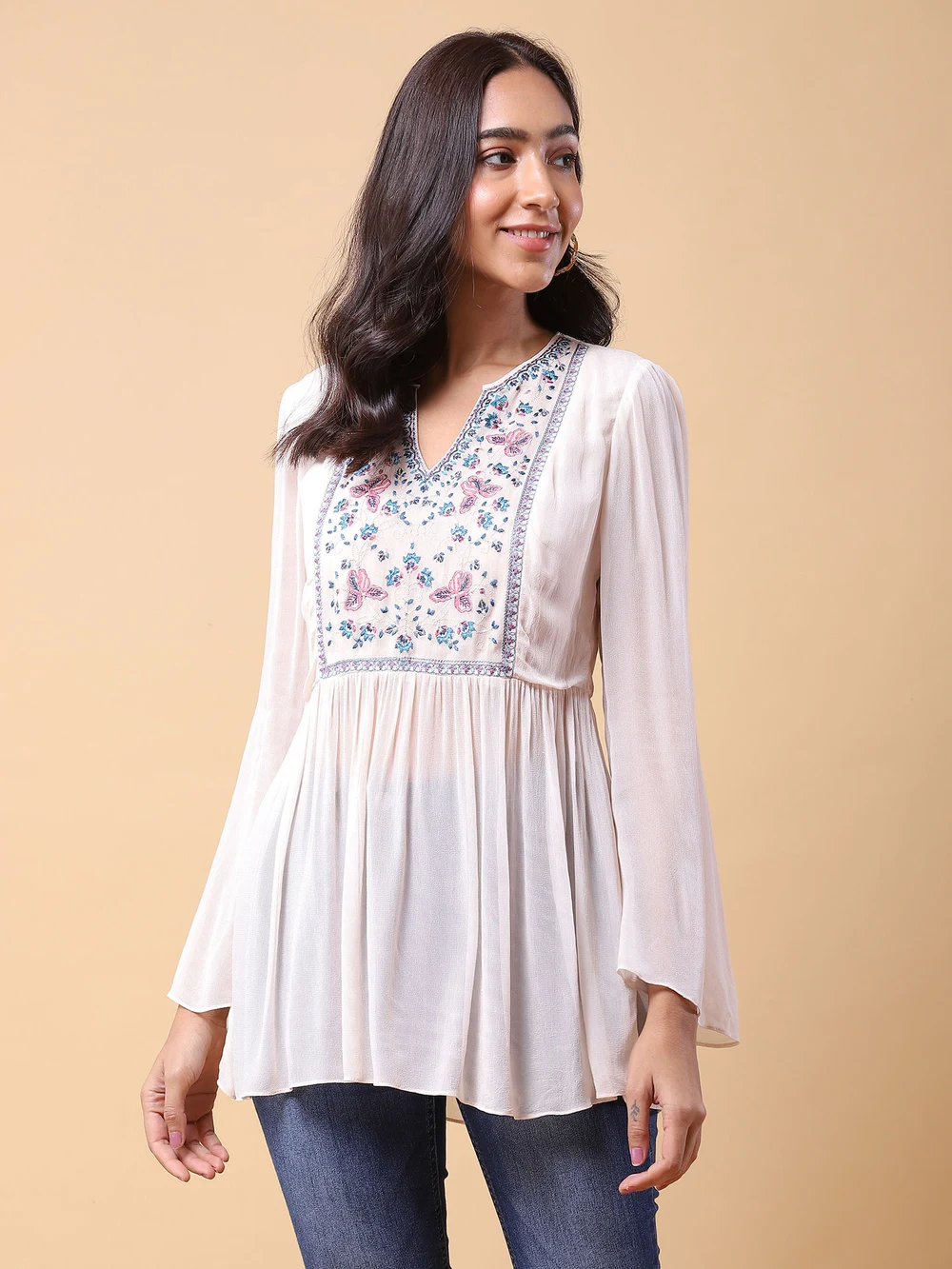 Flowy White Blouses: Flowy white blouses with loose sleeves and intricate embroidery are perfect for achieving the boho chic look. Pair them with denim cutoffs, a maxi skirt, or flared jeans.